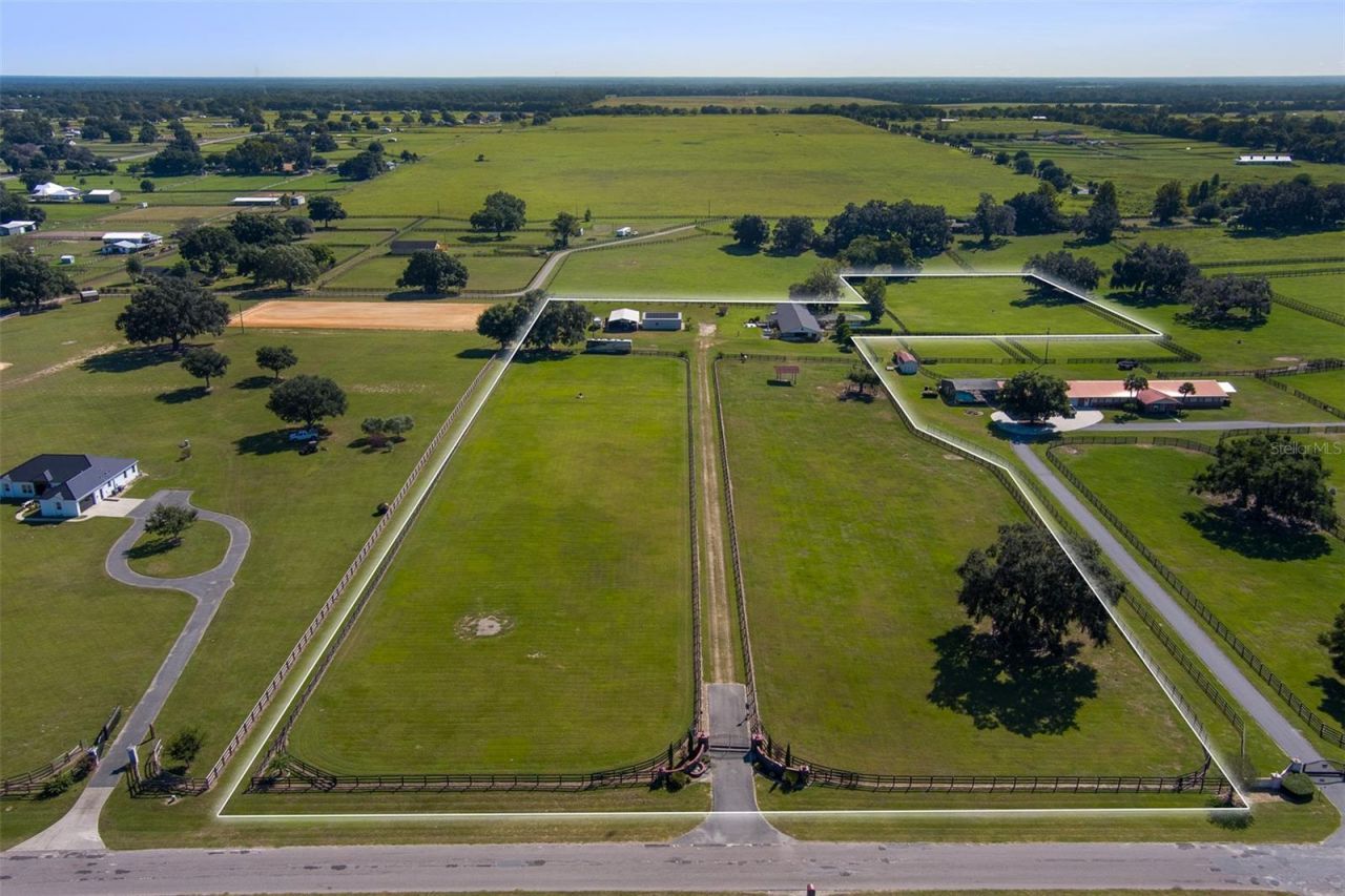 Welcome to Fox Squirrel Farm, a beautifully maintained 10-acre property located in the Cardinal Hill Complex in North Ocala. Just 20 minutes from the World Equestrian Center, this fully fenced farm offers a peaceful, private setting shaded by majestic oak trees and accented with fruit trees and lush green paddocks. The property features a 7-stall concrete block barn, thoughtfully connected to the main residence and equipped with individual stall fans, hot water, and a full-house generator that powers both the home and barn. The charming 2-bedroom, 1-bathroom home boasts parquet and tile flooring, and opens to a screened outdoor lounge area through sliding glass doors. Perfect for relaxation or training, the backyard features a 5-foot deep endless lap pool with heating and cooling capabilities. You'll also find a workshop with attached wash racks, an equipment pole barn, and a 1-car garage. Solar power adds to the efficiency and sustainability of this well-appointed farm, making it a rare opportunity for equestrian enthusiasts seeking both convenience and tranquility in the heart of Marion County.