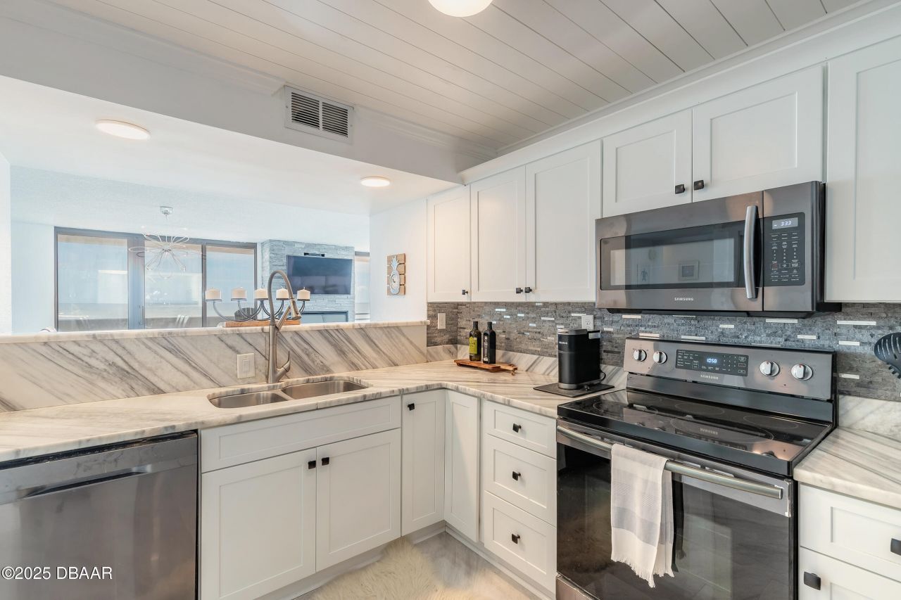 Experience elevated coastal living in this beautifully appointed 3-bedroom, 2-bathroom condominium at Horizons Condominium, located on the 6th floor with sweeping views of world-renowned Daytona Beach. The modern kitchen is a highlight, complete with sleek quartz countertops & a convenient breakfast bar ideal for casual meals or hosting. The spacious living and dining areas flow seamlessly to a private balcony"perfect for relaxing to the sound of the waves and enjoying the ocean breeze. The family room showcases a custom stone fireplace & sweeping ocean views, with seamless access to the balcony"offering an elegant setting for relaxation & entertaining. The primary suite offers a peaceful retreat, with direct access to the balcony, a cozy stone fireplace, & an en-suite bath featuring dual sinks. Two additional guest bedrooms provide ample space, with views of the intracoastal & colorful sunsets. Perfectly situated near premier dining, popular beach spots, and icon attractions, this property is ideal for personal use or as a strong investment opportunity. Horizons is a condo hotel with the convenience of management on the property if you choose to make this a part-time home. Schedule your private tour today and discover refined beachfront living at Horizon in Daytona Beach.