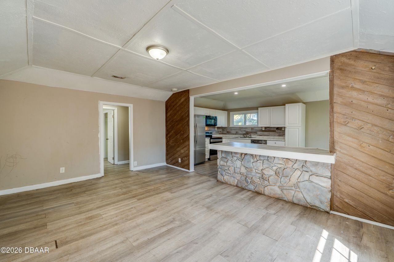 This 3-bedroom, 1-bath home is full of potential and ready for your personal vision. It offers an inviting layout with an entry foyer, a large table-space kitchen with a breakfast bar open to the spacious Living Room. A covered front porch provides a welcoming spot to relax and enjoy the peaceful setting. Situated on a ¼-acre, the property features a huge fenced front yard shaded by a beautiful Live Oak and a gorgeous view across the street to a stand of mature Old Florida trees. The oversized detached two-car garage includes stairs to a floored attic space that could easily be finished as a playroom, office, workout room, or used for abundant storage. Located just 4 miles (10 minutes) from the beach and historic Beach Street in downtown Daytona, where you'll enjoy great dining, shops, galleries, and year-round events. Convenient to the Daytona International Speedway, the International Airport, and major highways and offering easy access to Orlando, the location is ideal for a .. full-time or 2nd home, a renovation/resale, or a longer term investment. Bring your tools and imagination: this fixer-upper is full of potential and waiting for you to add your finishing touches!