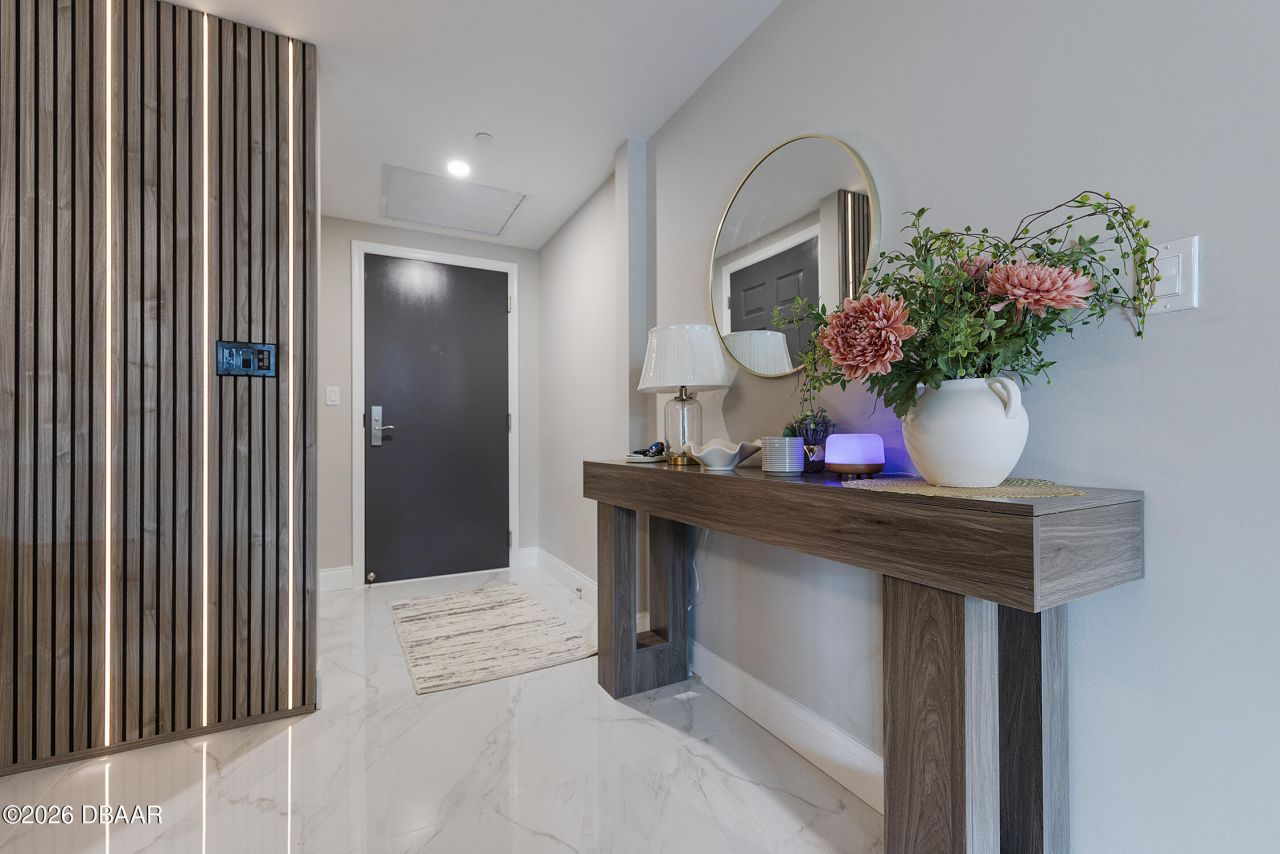 Welcome to a one-of-a-kind coastal retreat at the iconic Marina Grande Condominium"a fully reimagined, luxury first-floor riverfront condo offering the perfect blend of sophisticated design, effortless living, and resort-style amenities.This 2-bedroom, 2-bath residence has undergone a total high-end remodel, with walls thoughtfully removed to create an expansive, light-filled layout that lives far larger than expected. Freshly painted throughout in soft, neutral tones"including new accent paint on all doors"the home feels modern, calm, and timeless. New designer lighting elevates every space with warmth and elegance.Living areas feature striking 32'' white porcelain tile laid on the diagonal. Both bedrooms offer warm, durable LVP flooring. A stunning custom fluted feature wall in the dining area with integrated lighting, seamlessly carried into the kitchen bar area and living room TV wall, creates a cohesive designer aesthetic throughout. The kitchen has been completely redesigned and expanded with the removal of two walls and relocation of the laundry area. The result is a large, open chef's dream kitchen featuring newly installed top-of-the-line modern cabinetry, including glass front cabinets with modern interior vertical lighting, quartz countertops with waterfall edges, that extend up the backsplash walls, dedicated coffee bar, all new high end stainless steel appliances and a sleek modern range hood. Your living room is a true showstopper with a custom feature wall designed to accommodate an oversized 98 inch TV, floating illuminated shelves, and a built-in electric fireplace perfect for relaxing or entertaining. The guest bedroom closet has been enlarged and reconfigured to house a top-of-the-line LG Slimline stackable washer and dryer (largest capacity in its class easily fits king-size comforters). Finished with stylish opaque louvered barn doors. The guest bathroom has been fully renovated with a floating vanity, integrated lighted mirror, large white-tiled shower, modern porcelain tile flooring, and a new smart toilet. The spa-like primary bathroom is exceptionally spacious and elegant, featuring double vanities, an extra-large walk-in shower, and a luxurious soaking tub-your private sanctuary. The primary bedroom is spacious, accommodating a king size bed, and very large furniture as well. Your bedroom also has sliding glass doors that lead directly out to your patio area.First-Floor Advantages: Enjoy the ultimate convenience of first-floor living: no elevators, effortless grocery unloading, and direct access to outdoor amenities. Dog owners will love the ease of stepping directly from the patio or front door. The unit also includes one of the most coveted first-floor parking spaces, located just steps away.Your resort style amenities include two waterfront pools, fitness center, yoga and dance studios, movie theater, outdoor and indoor areas for social activities, library and game room, 24/7 gated security and concierge service. There are also potential plans for a private marina for the boating enthusiast. This condo home has it all. Everything has been done for you in this move in ready luxurious residence.