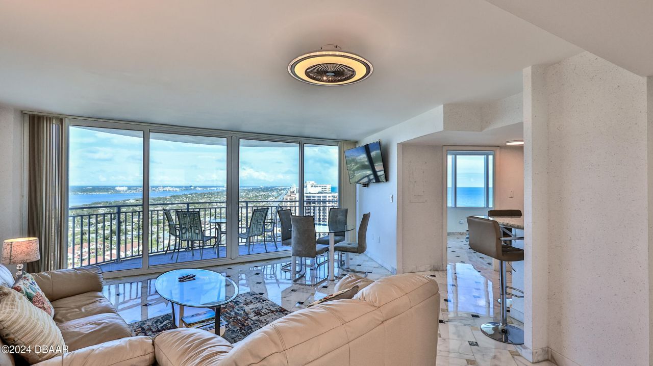 Prepare to be wowed the moment you step through the door of this exquisite oceanfront condo, where 180-degree views of the Atlantic Ocean and Halifax River will take your breath away. With unobstructed vistas stretching for miles, this stunning unit combines luxury living with excellent investment potential, making it perfect for short-term rentals or your personal beach getaway. Almost floor-to-ceiling windows invite natural light and offer panoramic views that create a serene atmosphere. Enjoy mesmerizing sunrises and sunsets from the comfort of your own private balcony. Every inch of this condo has been tastefully updated. The elegant marble flooring adds a touch of sophistication to the open living space, split-plan layout with two generous bedrooms and two modern bathrooms. Perfect for families or guests, each room offers a tranquil retreat. Take advantage of resort-style amenities, including a heated pool, hot tub, fitness center, and tennis courts. Engage in friendly... competition on the pickleball courts or simply relax by the ocean. Situated in the vibrant Daytona Beach Shores community, you'll be just moments away from local shops, entertainment and a unique penthouse floor restaurant. Enjoy easy access to pristine beaches and a variety of water activities, ensuring that every day feels like a vacation. Don't miss your chance to own this breathtaking oceanfront condo that truly has the wow factor! Schedule your private showing today and experience the luxury and beauty of beachfront living in Daytona Beach Shores.