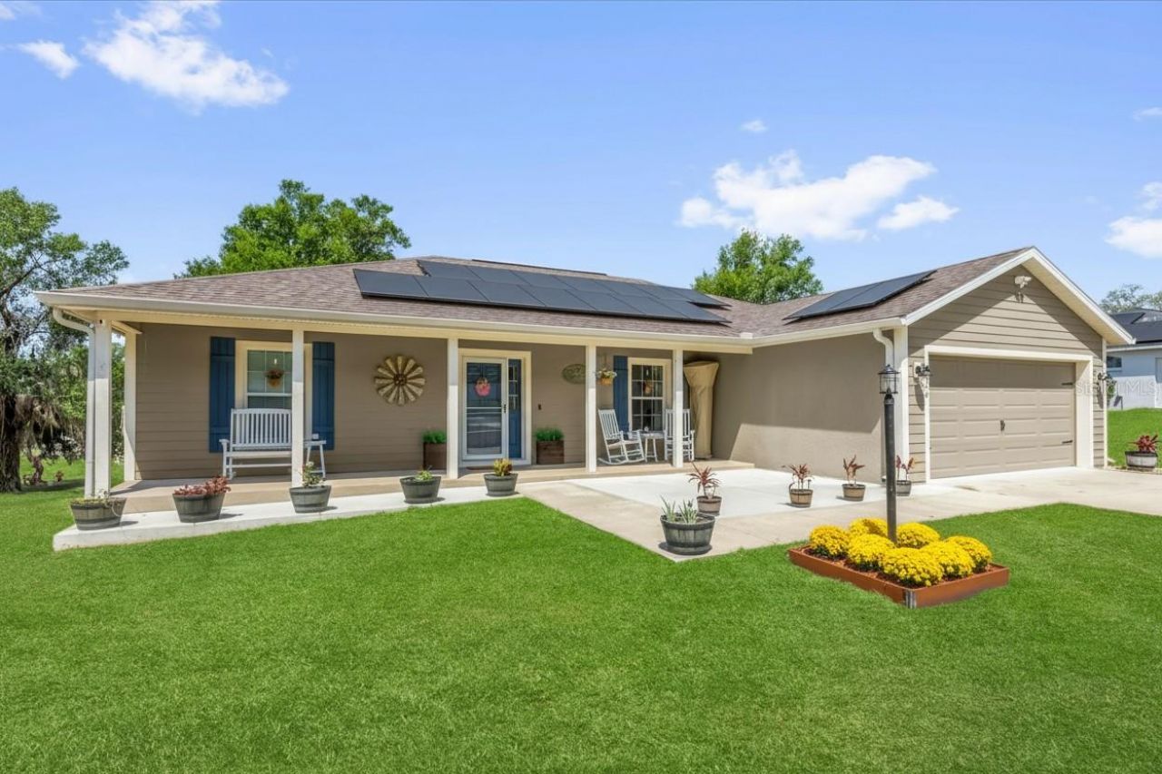 SOLAR SYSTEM WILL BE PAID OFF AT CLOSING-providing valuable energy savings from day one! This beautifully maintained 3-bedroom, 2-bath home, built in 2018, offers modern construction and comfortable Florida living in the desirable Stonewood Estates community of Lady Lake. Step inside to an inviting open floor plan filled with natural light and designed for both everyday living and entertaining. The spacious living area features a striking fireplace accent wall that creates a warm focal point, while the kitchen offers ample cabinetry, modern appliances, and seamless flow into the main living space. The private primary suite provides a relaxing retreat with a walk-in closet and en-suite bath, while two additional bedrooms offer flexibility for guests, family, or a home office. Enjoy welcoming curb appeal with a charming front porch and a peaceful neighborhood setting with a low HOA. Conveniently located just minutes from The Villages, shopping, dining, and major roadways, this home offers easy access to recreation, golf, and entertainment while maintaining a quiet residential feel. With energy efficiency, modern construction, and an unbeatable location, this move-in ready home presents an incredible opportunity for buyers seeking comfort, convenience, and long-term savings. USDA eligible with $0 down payment.