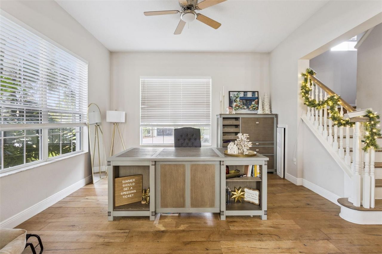 This stunning home offers nearly 3,500 square feet of living space, featuring four spacious bedrooms, four full bathrooms, and one half bath. From the moment you step onto the large covered front porch and enter the grand foyer, you'll be impressed by all this home has.Beautiful hardwood floors flow throughout the main living areas on the first floor, seamlessly connecting the formal living and dining rooms to the expansive layout. The home includes a three-car garage and showcases solid-surface countertops in both the kitchen and bathrooms.The large, open kitchen is equipped with stainless steel appliances and overlooks the inviting family room-perfect for everyday living and entertaining. The spacious primary suite features built-in shelving in the walk-in closet, while the luxurious primary bathroom offers separate vanities, a garden tub, and a large walk-in shower. Additional bedrooms and bathrooms are generously sized, providing comfort and flexibility for family and guests. Outside, enjoy a screened back porch and mature landscaping, creating a peaceful outdoor retreat. Offering abundant space paired with luxury amenities, this home is a wonderful opportunity for your next chapter. You're also nestled within a well-established gated community, this property enjoys an enviable location close to major highways, ensuring convenient access to all amenities. Just minutes away, residents can indulge in excellent shopping opportunities, dine at a variety of luxury and casual eateries, and explore nearby theme parks for entertainment. The neighborhood benefits from proximity to brand-new, state-of-the-art hospitals and a top notch school system, providing peace of mind for residents seeking quality healthcare services and high end education for their family. This vibrant community offers an abundance of options to suit every lifestyle need and preference. Call today to schedule a private tour.