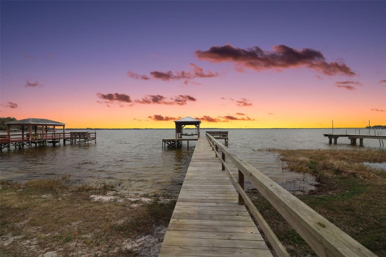 WELCOME TO LAKEFRONT PARADISE ON BEAUTIFUL Lake Yale, COMPLETE WITH YOUR OWN PRIVATE BOAT DOCK AND ACCESS TO SOME OF THE BEST FISHING IN LAKE COUNTY! Welcome home to this tranquil Leesburg community nestled along the shores of Lake Yale, a stunning 4,000-acre sandy-bottom lake that offers a true nature lover's paradise. Follow the private road to your own slice of Old Florida charm, where breathtaking panoramic water views welcome your home. The lush .28-acre property is shaded by majestic moss-draped oaks and clusters of swaying palm trees that scatter dappled sunlight across the beautiful yard, creating a peaceful tropical setting. A spacious driveway with an extended parking pad leads to a two-car carport, providing plenty of room for family and guests. This meticulously maintained 1994 manufactured home has been thoughtfully updated for peace of mind, including a whole-house replumb and new main roof in 2026, a flat roof replaced in 2022, and an A/C system installed in 2022. Step inside to a bright, open interior with vaulted ceilings and expansive windows that showcase mesmerizing lake views. Each morning, dazzling sunrises paint the sky in vibrant shades of pink and orange, a spectacular show courtesy of Mother Nature that can be enjoyed from the living areas and lanai, offering a serene and uplifting start to your day. The open layout is perfect for entertaining, enhanced by soothing coastal wall colors and neutral wood-tone luxury vinyl flooring that flows throughout the home. The kitchen is both attractive and highly functional, featuring classic Shaker-style cabinetry, beautiful granite countertops, stainless steel appliances, a wall of glass-front display cabinets, a built-in desk area, and an expansive breakfast bar that is ideal for casual dining or entertaining. Several inviting spaces offer wonderful options for relaxing or gathering with friends and family, including a charming kitchen dinette, an enclosed side porch with A/C, and a spacious living and lanai area featuring three walls of vertically sliding windows that allow refreshing lake breezes to flow through the home. The primary bedroom offers a walk-in closet and a private bathroom with a Corian vanity, shower, and linen storage. The guest bedroom is conveniently located near the full hallway bath. Within the screened porch, you will find a separate storage and workshop room with a dedicated laundry space and a window A/C unit, providing a perfect spot for hobbies, projects, or additional storage. Designed to embrace the beauty of its waterfront setting, this home offers multiple places to enjoy the outdoors, from the living and lanai area and enclosed side porch to the rear screened porch and the lush backyard overlooking the water. Step out to your private boat dock with a large sun deck and imagine your best lake life as you boat, kayak, or fish on the beautiful waters of Lake Yale. Here, peace, serenity, and the tranquil sounds of nature create the perfect lakeside retreat!