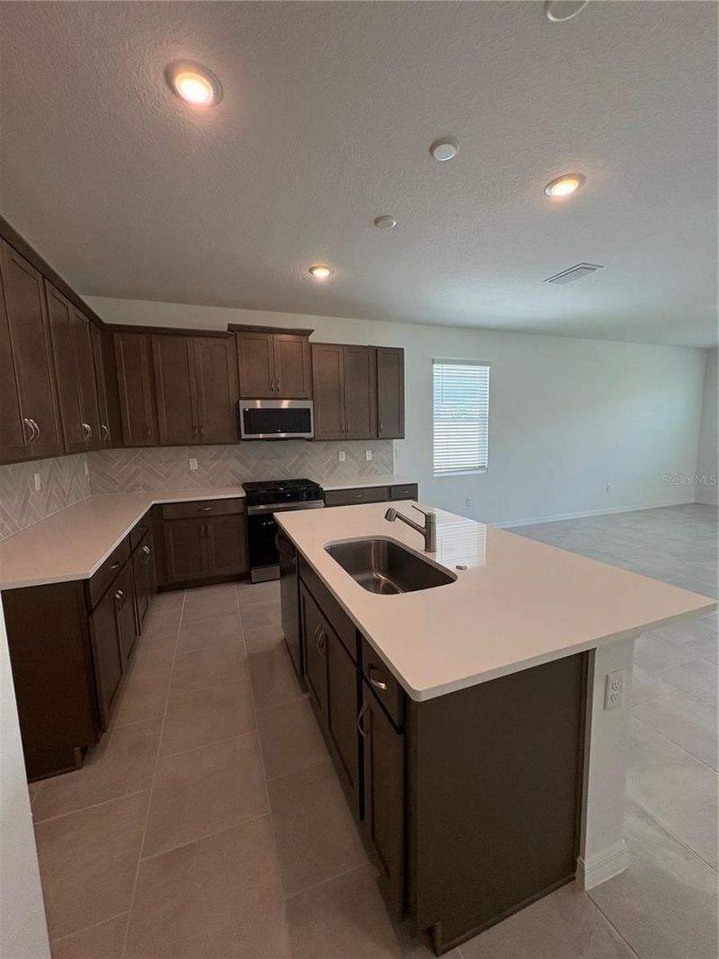 Welcome to our last Myrtle plan available backing to green space and walking trails with outdoor exercise equipment, that leads to the community pool! This charming new home exudes comfort and style, starting with a welcoming front porch and continuing through its thoughtfully crafted open-concept layout. With soaring 9'4 ceilings, this 3-bedroom, 2-bath home features a spacious Great Room that opens to a covered rear lanai, perfect for indoor-outdoor living. The well-appointed kitchen boasts 42 upper cabinets with crown molding, quartz countertops, a sleek tile backsplash, stainless steel appliances, and a center island ideal for entertaining. Elegant tile flooring enhances the main living areas, while window blinds throughout add both privacy and convenience. The luxurious Primary Suite offers a generous walk-in closet and a beautiful en-suite bath with dual sinks, quartz countertops, linen closet, and walk-in shower with upgraded wall tile surround. A 2-car garage and brick paver driveway and lead walk complete the polished exterior of this must-see home. Outstanding Community amenities include covered Playground and walking trails featuring outdoor exercise equipment, with future amenities to include pool and cabana. Oakview is conveniently located just 1 mile from SR 429 for easy commuting, and only 11 miles from Wekiwa Springs State Park and 12 minutes from Lake Apopka. Additionally, the Community is close to the upcoming new Wyld Oaks development featuring a 3 acre medical campus and extensive retail spaces.