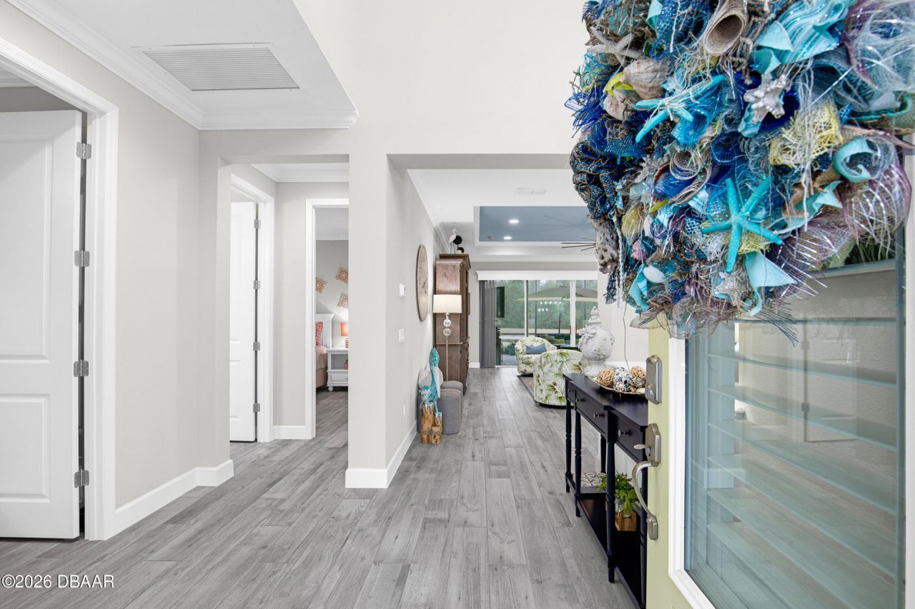 Welcome to the beautifully upgraded St. Bart model in Margaritaville, where every day feels like a getaway. This 3-bed, 3-bath home with a den blends refined finishes with relaxed coastal living. The gourmet kitchen features quartz countertops & backsplash, gas cooktop, double wall ovens & extensive cabinetry, lighting. Plank tile flooring & crown molding flow throughout, adding a polished touch to every room.The extended screened lanai becomes an outdoor retreat, complete with a full summer kitchen, beverage refrigerator & peaceful pond views- perfect for entertaining or unwinding. Thoughtful upgrades throughout elevate comfort & style including 8 ft doors, custom closets, spa like primary bath. Garage includes storage racks, extra fridge, surge protector & portable generator. GOLF CART INCLUDED. Residents enjoy a true resort lifestyle with the paradise pool, sport pool, pickleball, fitness center, on-site dining & convenient shuttle service to the private beach club & more.