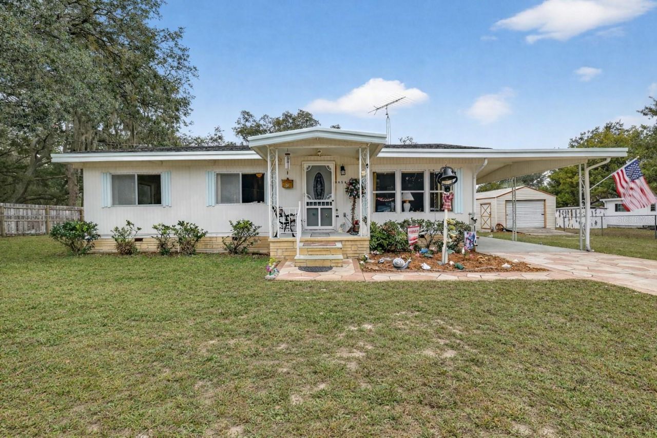 CASH ONLY NO HOA FURNISHED LARGE YARD EXTRA STORAGE LARGE SUNROOM NEW WELL PUMP & BLADDER TANK NEW APPLIANCES FENCED IN Welcome to 9950 SE 169th Street - a rare opportunity to own a well-maintained, move-in-ready manufactured home with an oversized lot in the heart of Summerfield. This Skyline-built manufactured home offers lasting quality and craftsmanship that's hard to find today. With 2 bedrooms and 2 full bathrooms, this charming residence offers functional living spaces inside and out. The home opens into a cozy, carpeted living room that flows into the dining area and kitchen, where newer stainless steel appliances add a modern touch. 2010 HVAC.The layout is thoughtfully designed, with the spacious primary bedroom featuring an en-suite bath and walk-in shower, while the guest bedroom includes a ceiling fan and a built-in closet with easy access to a second full bath. Step into the large, enclosed sunroom, an ideal flex space, and out onto the expansive 12x20-foot patio, perfect for entertaining or relaxing under the Florida sky.Outside, the fully fenced 0.35-acre yard includes a 14x30-foot detached garage, a 10x20-foot shed, and another 12x16-foot storage shed, which includes the washer and dryer. There's ample space for a garden, workshop, animals, or even a home business. The stamped concrete driveway, carport, and mature trees add both function and charm. Located minutes from Hwy 441, 301, The Villages, shopping, dining, and local schools. This is a must-see with endless potential.