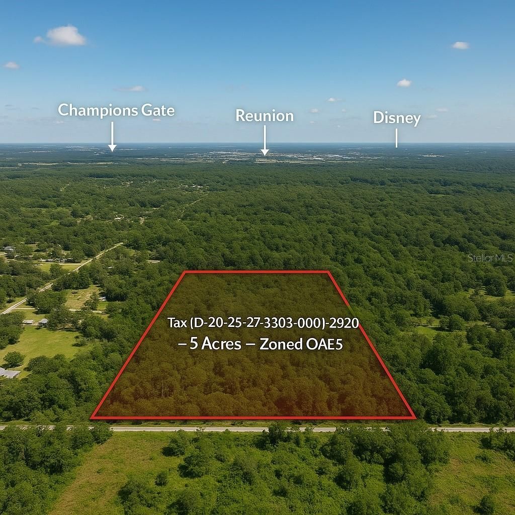 Final price drop, Discover an Exceptional 5-Acre Lot in Happy Trails - A Rare Opportunity Near Champions Gate, Reunion, and Disney.Nestled in the prestigious Happy Trails community, this expansive 5-acre vacant lot presents a one-of-a-kind opportunity to bring your dream estate to life. Perfectly situated in one of the highest-elevated areas of the neighborhood, this property offers both privacy and prestige-right next to world-renowned communities such as Champions Gate, Reunion, and just minutes from Disney. The seller is a civil engineer expert in mitigation and has the plan in place to build on 1/3 of an acre. please review attachments mitigation strategy included.This lot is ready for development, with critical groundwork already completed, including:Environmental SurveyTopographic SurveyArchitectural Design & Preliminary PlansThe property allows you to build up to three-thirds of an acre, totaling 15,520 square feet of living space. Additionally, you can design two detached garages with modern loft apartments on top, adding both functionality and flexibility to your estate.Happy Trails is known for its tranquil setting and luxury lifestyle, making it one of the most desirable areas in Central Florida to build. With prime location, stunning surroundings, and unbeatable neighbors, this lot combines the best of seclusion, accessibility, and long-term value. Whether you envision a private retreat, a luxury family estate, or a custom residence that blends modern design with natural beauty, this property offers the canvas to create it. Your dream estate begins here-Happy Trails awaits.